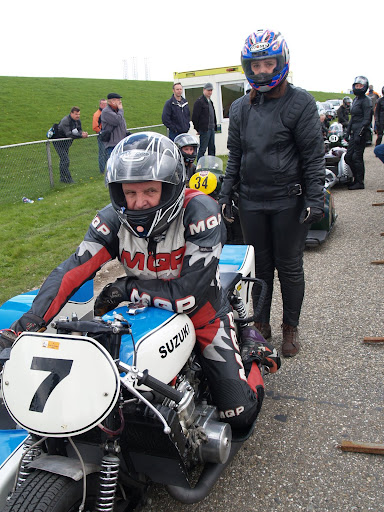 Op een drafje ging het heen en weer en net op tijd kon er een litertje bij in de tank. “Tja”, zei Gerrie, “Dat durfde ik toch echt niet aan, met zo weinig olie!” Ondanks de nu ruime olievoorraad viel het stel toch stil tijdens de trainingen, in de haarspeldbocht achter de dijk. Het lag niet aan de olie, gelukkig; na het nodige noeste gesleutel door Ingrid en haar monteur bleek het elektrische circuit problemen te hebben gegeven. Tja, dit is een combinatie van Engelse makelij, natuurlijk. Tijdens de montagewerkzaamheden beperkt Gerrie zich tot nerveus heen en weer lopen, kettingroken en het maken van opmerkingen. Als het om hardrijden gaat is hij echter op zijn plek.